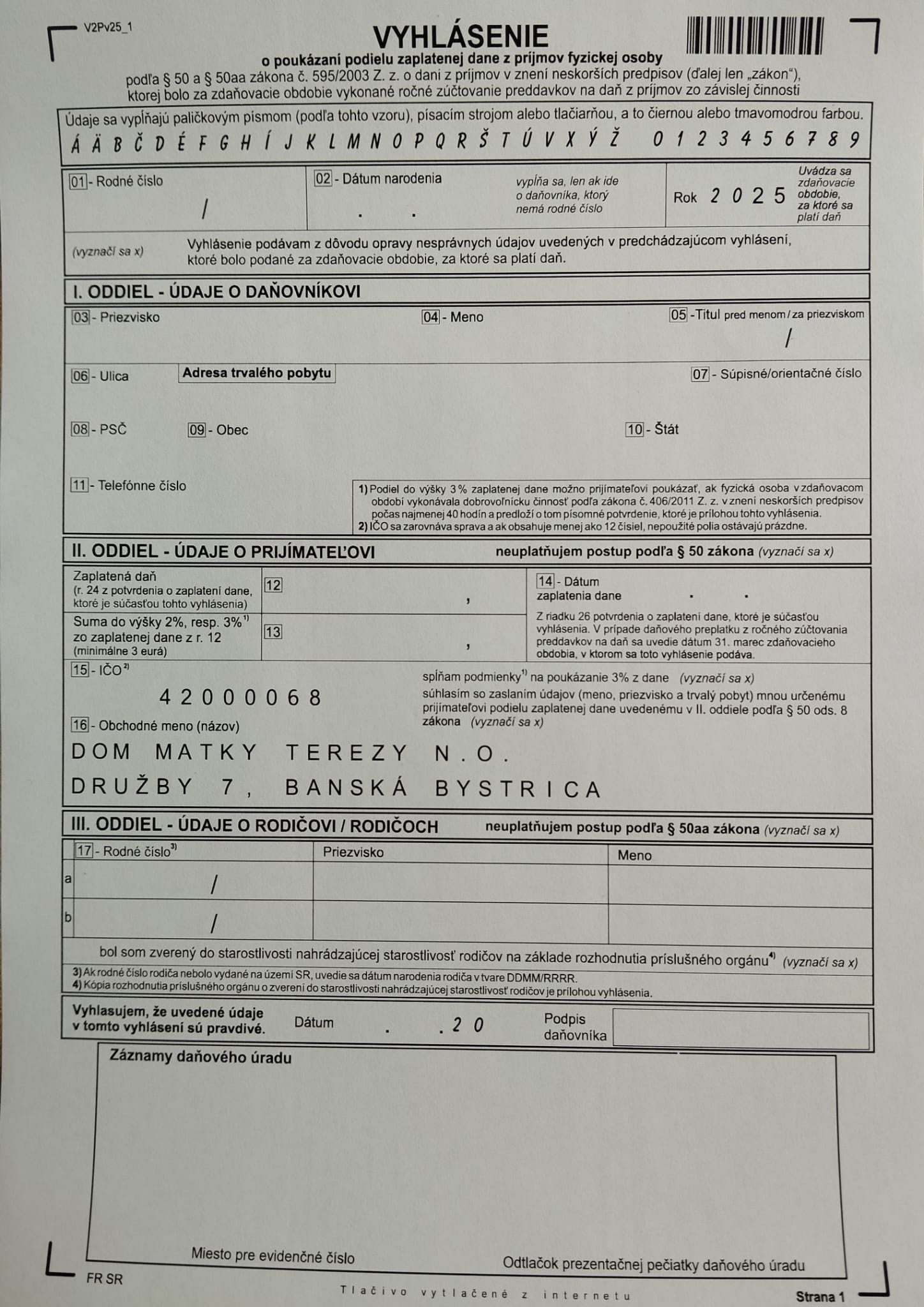 VYHLÁSENIE O POUKÁZANÍ PODIELU ZAPLATENEJ DANE Z PRÍJMOV FYZICKEJ OSOBY